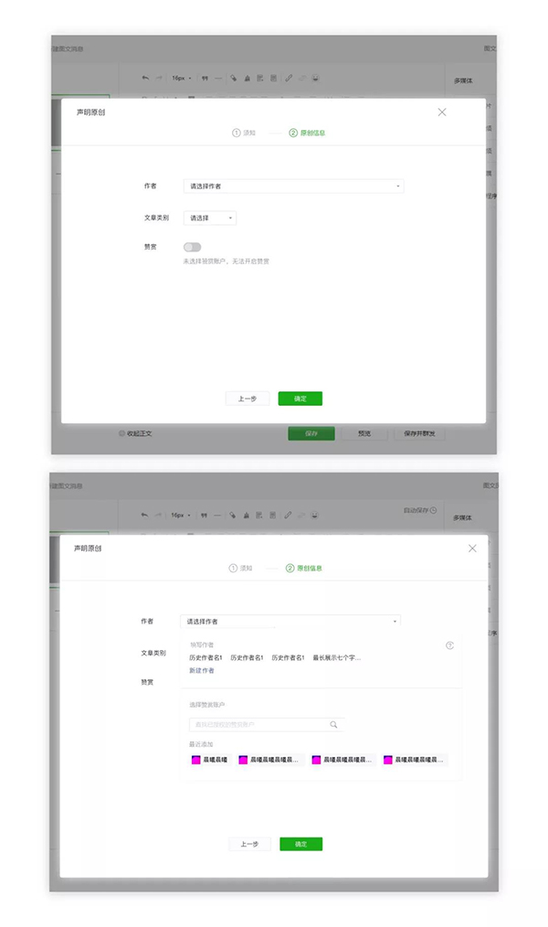 公眾號對文章聲明原創(chuàng)時,輸入贊賞賬戶名進(jìn)行查找。選擇了贊賞賬戶的文章可以開啟贊賞。