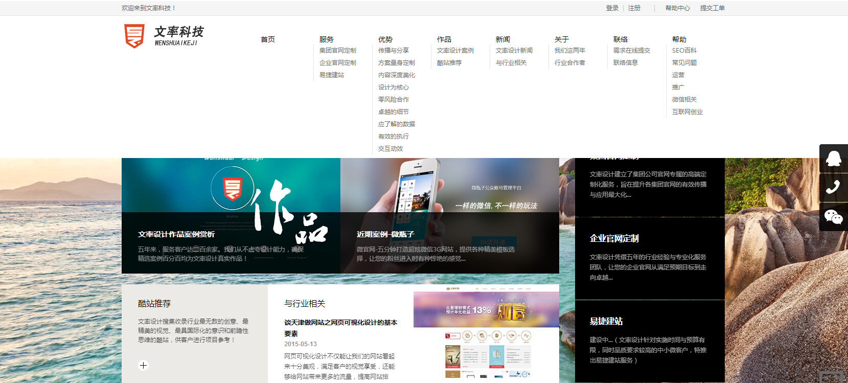 網(wǎng)站導(dǎo)航的設(shè)計(jì)要么千篇一律,沒(méi)有絲毫新意;要么千奇百怪,讓人無(wú)法理解;專注網(wǎng)站的網(wǎng)站導(dǎo)航設(shè)計(jì)應(yīng)該站在客戶和企業(yè)的角度之上綜合進(jìn)行考慮。首頁(yè)banner部分可讀信息過(guò)少等這些問(wèn)題從優(yōu)化角度分析都是網(wǎng)站制作所忽視的問(wèn)題。大家可以看下天津網(wǎng)站制作——文率科技的網(wǎng)站導(dǎo)航和首頁(yè)banner的設(shè)計(jì)簡(jiǎn)單大方可讀信息多,非常有利于用戶體驗(yàn),同時(shí)很容易被百度蜘蛛抓取。