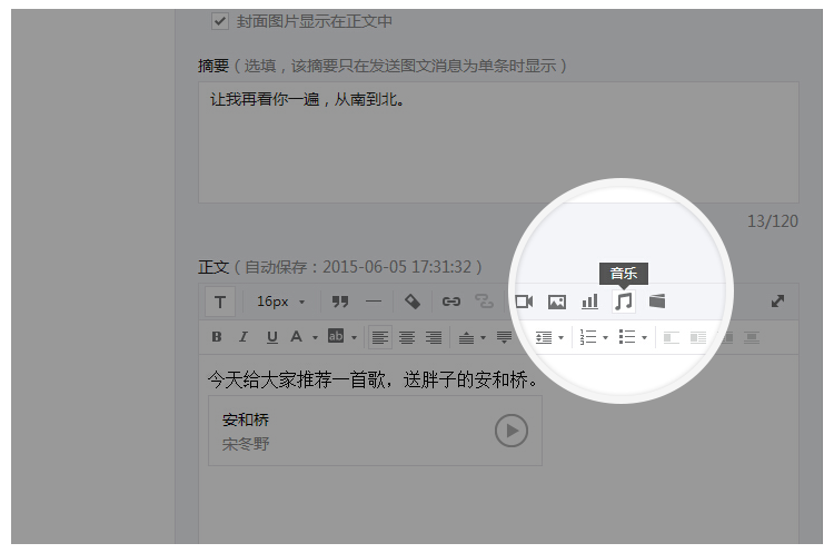 1. 運(yùn)營者可以在編輯圖文消息時(shí),在正文中插入音樂。