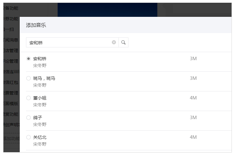 2. 選取音樂時(shí),支持根據(jù)歌名、作者進(jìn)行搜索,并且可以試聽音樂。