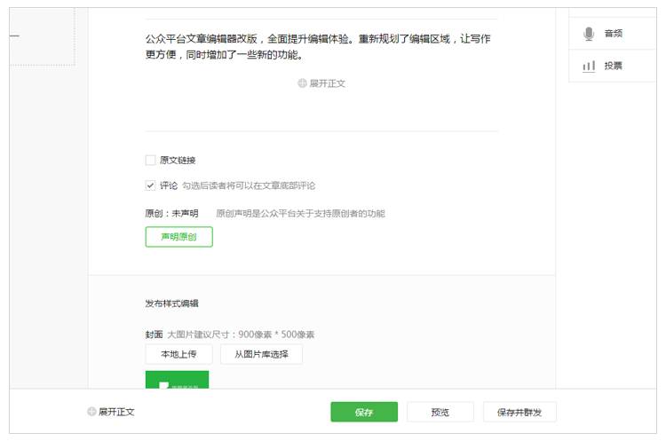 2、優(yōu)化長(zhǎng)文章編輯體驗(yàn)。新增收起/展開正文功能,幫你快速地檢查文章相關(guān)設(shè)置。
