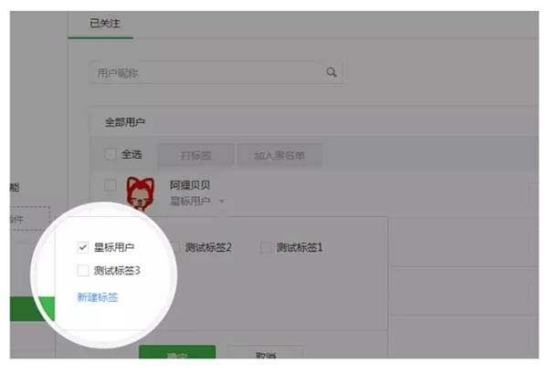運(yùn)營者可登錄公眾平臺(tái)后臺(tái),點(diǎn)擊左側(cè)菜單“用戶管理”后管理已關(guān)注用戶,點(diǎn)擊其中一個(gè)用戶右側(cè)的“標(biāo)簽”小角標(biāo)可彈出復(fù)選框快速為該用戶添加標(biāo)簽,且添加標(biāo)簽復(fù)選框內(nèi)已支持直接新建標(biāo)簽。