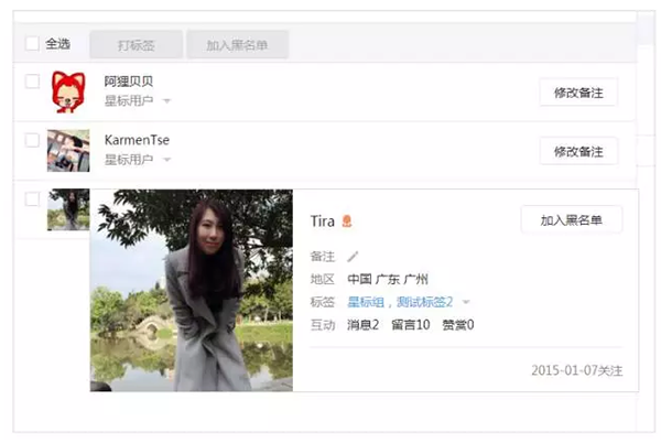 本期新增消息數(shù)、留言數(shù)和贊賞數(shù)等互動(dòng)數(shù)據(jù),且顯示用戶關(guān)注時(shí)間和支持查看用戶頭像大圖,有利于拉近運(yùn)營者與用戶的距離。