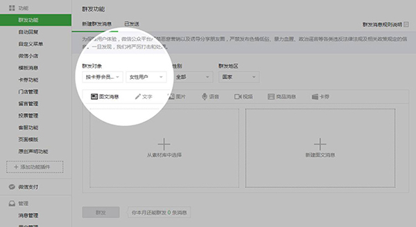 商家可以根據(jù)自身需求,在會員管理頁面為會員添加自定義標簽,群發(fā)消息時,可選擇指定的會員標簽定向群發(fā)。注意,會員需關注公眾號才能收到商家群發(fā)的消息。