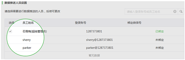 2. 選擇需要接收數(shù)據(jù)推送的操作員(說明:接收數(shù)據(jù)推送需要先登記操作員的微信號(hào))