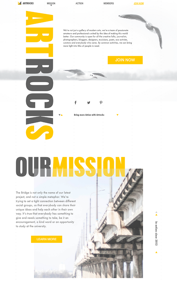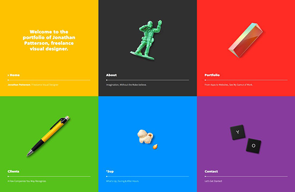 雖說(shuō)用戶進(jìn)入你網(wǎng)站之前都知道你企業(yè)是做什么的,不過(guò)清晰的行為召喚指引依然非常重要,不要以為用戶是你肚子里的蛔蟲(chóng),你往往需要通過(guò)指引來(lái)引導(dǎo)他們你所希望的事情,較為常見(jiàn)的的行為召喚方式是按鈕,填寫(xiě)表單,引導(dǎo)說(shuō)明(比如“滾動(dòng)以查看更多”),甚至動(dòng)畫(huà)。:Jonathan Patterson 的著陸頁(yè)中,每個(gè)明亮的色塊都會(huì)在光標(biāo)懸停的時(shí)候變暗,并且予以說(shuō)明,引導(dǎo)用戶去點(diǎn)擊獲取更多信息。