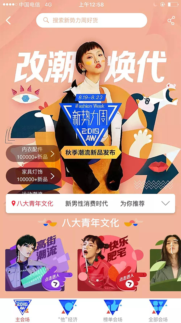 如;當(dāng)前的淘寶西新勢(shì)力中有些會(huì)場(chǎng)頁(yè)面做的非常的不錯(cuò),視覺(jué)風(fēng)格非常的統(tǒng)一,一眼就可以看出來(lái)是實(shí)體模特+手繪圖形相結(jié)合的風(fēng)格形式,并且在模特臉部還做了一些圖案輪廓線,然后模特周圍點(diǎn)綴一些手繪圖案做氛圍,有點(diǎn)達(dá)達(dá)主義的趕腳。