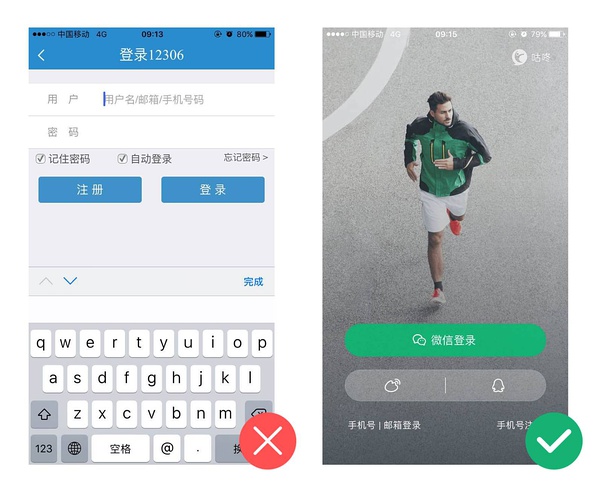 美學在設計產(chǎn)品的使用上扮演著重要的角色。美的設計能促進人們形成正面積極的態(tài)度,而且讓人們對產(chǎn)品設計上的缺陷更具有包容性。如:同樣都是登錄頁面我們更容易接受右面的設計,并且我們會通過是否美觀推斷右面的APP應該更好用,畢竟一個好用的APP應該都會好好“打扮”一下吧!