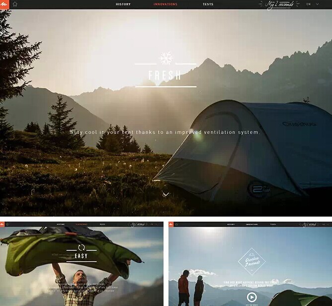 例如,Quechua山地運動品牌,通過幾張照片和簡單文字的說明,將Quechua帳篷的特點及所處環(huán)境真實體現(xiàn),仿佛一場美妙之旅讓人心動。