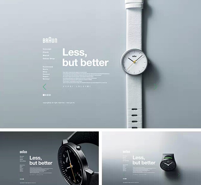 例如:“獸人必須死”首發(fā)引導(dǎo)頁面,周圍大面積留白,并結(jié)合簡潔的排版,讓頁面模塊之間區(qū)分明顯,視覺集中,很好的給用戶引導(dǎo),給人一種精致和輕松感。例如:BRAUN博朗,整個頁面,簡潔的圖片與文字的排版,讓視線非常集中,這樣用戶快速的將注意力集中到內(nèi)容上去,非常符合他們的主題“Less,but better”,給人留下回味、想象的空間。