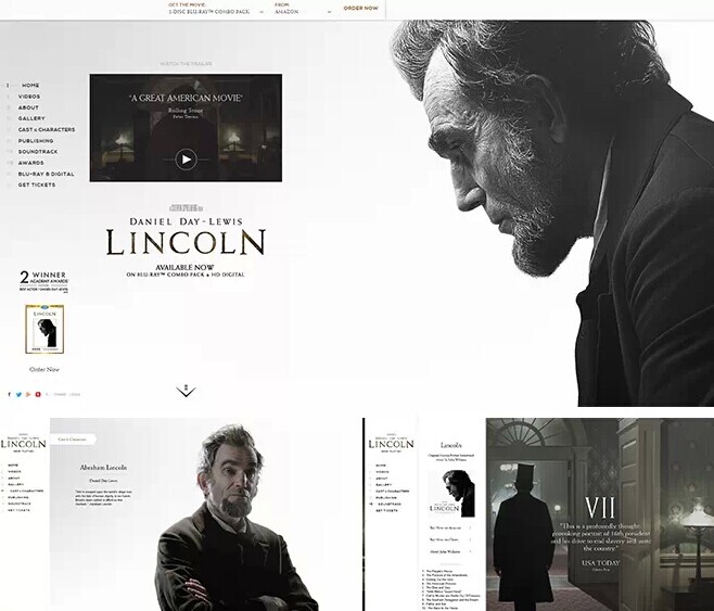 例如:LINCOLN電影網(wǎng)站,運用最常用的黑白兩種顏色搭配,讓網(wǎng)頁如此簡約大方,給人留下無限想象空間。