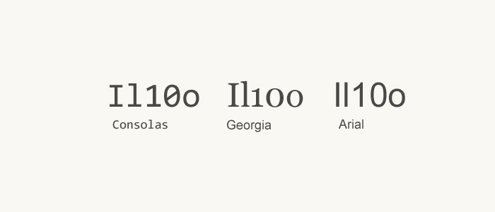 在Arial字體中,i,l 的辨識(shí)度很低,而且當(dāng)有連續(xù)的il等較窄文字出現(xiàn)時(shí),文字難以選中。此外Georgia中,字母o,與數(shù)字0 只在大小上略有區(qū)別,基本上分不清,很難做到一目了然。由此可見,等寬字體受字母本身的干擾較小,字母大小固定,密度固定,此類字體,簡(jiǎn)單容易辨認(rèn),大大提升了閱讀效率。