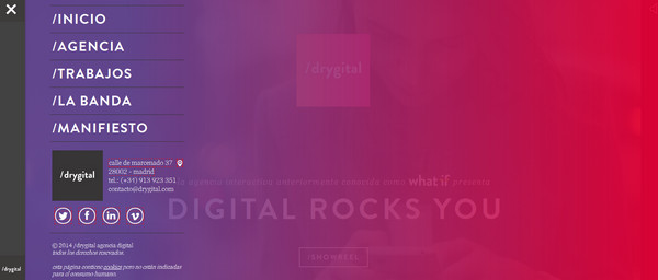 Drygital的主菜單流露出歡樂積極的情感。華麗鮮艷的漸變背景,非常有利于展現(xiàn)亮白色的導航。一如往常,菜單覆蓋了整個主頁。不過得益于半透明的背景,用戶可以在著陸頁欣賞一段視頻。