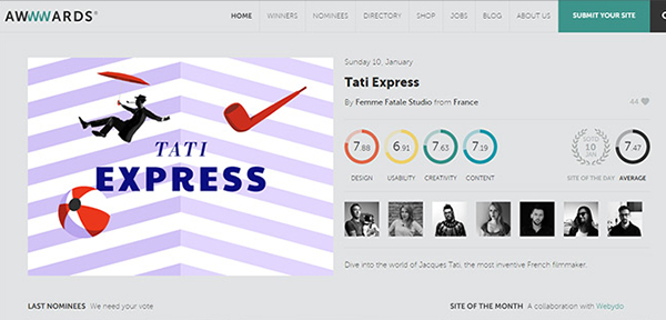 Awwwards不只是一個(gè)展示網(wǎng)頁(yè)設(shè)計(jì)的網(wǎng)站,它邀請(qǐng)一些有地位的設(shè)計(jì)師、博客和機(jī)構(gòu)組成一個(gè)多學(xué)科的評(píng)審小組對(duì)設(shè)計(jì)師的網(wǎng)頁(yè)設(shè)計(jì)進(jìn)行評(píng)分,大家可以查看獲獎(jiǎng)?wù)呒氨惶崦说淖髌?,Awwwards也會(huì)舉辦會(huì)議來(lái)嘉獎(jiǎng)那些對(duì)網(wǎng)頁(yè)設(shè)計(jì)做出貢獻(xiàn)的獲獎(jiǎng)?wù)?,它也?huì)幫助相關(guān)機(jī)構(gòu)發(fā)布招聘信息。與此同時(shí),Awwwards還擁有自己的網(wǎng)上商店用于售賣網(wǎng)頁(yè)設(shè)計(jì)相關(guān)書籍。