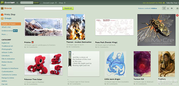 Deviant Art是屬于一個(gè)社區(qū)網(wǎng)站,你可以在里面找到數(shù)碼設(shè)計(jì)、皮膚、主題、壁紙等圖片,還有傳統(tǒng)藝術(shù)、攝影、詩(shī)歌、散文以及藝術(shù)圖案等精美的設(shè)計(jì)案例,有利于幫助你很好的尋找靈感,設(shè)計(jì)出更多的精美的作品。