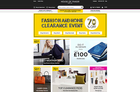 隱藏式菜單在電商類網(wǎng)站中的作用是非常重要的,巧妙的利用隱藏式菜單能夠清理電商網(wǎng)站雜亂的版面,最初它們是為移動端設計的,但現(xiàn)在也越來越多用在桌面端的設計中。2015年,許多在線銷售商在大大小小的屏幕上都使用了隱藏式導航菜單,節(jié)省了大量屏幕空間,這個趨勢在2016還會持續(xù)增長。如今,互聯(lián)網(wǎng)中很多知名在線商城都使用了隱藏式菜單,如:House of Fraser。