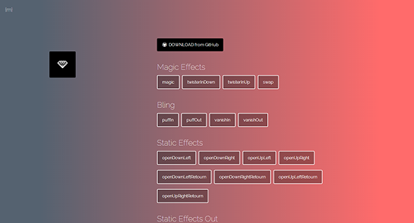 Magic CSS3 Animations是一個特殊效果的CSS3動畫庫,你可以盡情的免費用于你的web項目之中,為您的項目增添不一樣的動態(tài)效果,操作非常的簡單,只需簡單的引用CSS樣式:magic.css或精簡版magic.min.css即可。