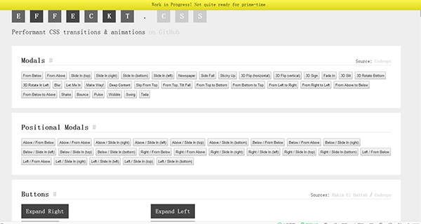針對不同UI的CSS3動畫和過渡效果集,包含了豐富的CSS3動畫和過渡效果,包括:Modal、overlay、button、list、listscroll、Caption等等,相信如果你需要支持動態(tài)CSS3動畫或者過渡效果的話,這一套完整的UI動畫及其過渡效果解決方案肯定會讓你滿意!