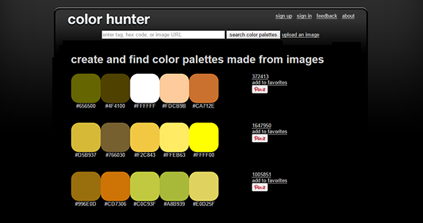 ColorHunter在線配色篩選工具是一個可以按照圖片來自動生成相應的不同調色板,也就是配色方案。如果你想尋找某種風格的配色方案,可以在網(wǎng)站上方的搜索區(qū)域進行相應的搜索。除了根據(jù)圖片來尋找配色外,你還可以輸入tag名稱、16進制顏色值或Flickr網(wǎng)站中的照片(圖片)網(wǎng)址進行搜索。