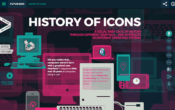 圖標(biāo)設(shè)計(jì)需要契合整個(gè)設(shè)計(jì)策略,仔細(xì)審視你所需要設(shè)計(jì)的內(nèi)容和風(fēng)格,再將圖標(biāo)和流行的元素結(jié)合起來(lái),營(yíng)造出符合現(xiàn)代風(fēng)格的美學(xué)特征。另外,圖標(biāo)最大的特性就是它具有靈活性,它從形狀到細(xì)節(jié)都可以充滿藝術(shù)性,從手繪風(fēng)到扁平化,從精致擬物到藝術(shù)化處理都很容易實(shí)現(xiàn)。而上面這個(gè)關(guān)于圖標(biāo)歷史的網(wǎng)站就展示了多年來(lái)圖標(biāo)風(fēng)格的演變,這些圖標(biāo)所呈現(xiàn)出來(lái)的風(fēng)格、色彩、使用方法和規(guī)格都非常值得設(shè)計(jì)師們研究學(xué)習(xí)。