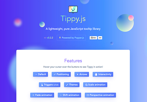 Tippy是一款輕量級的純JS工具提示庫,其中包含了大量不同的交互相關(guān)的提示內(nèi)容,它的出現(xiàn)對設計師的工作有很大的幫助,并且它的兼容性非常的好,幾乎可以適用于任何瀏覽器,這也使得它幾乎可以輕松實現(xiàn)各種各樣的提示效果。