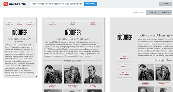 Xrespond絕對(duì)對(duì)得起“虛擬設(shè)備實(shí)驗(yàn)室”,這個(gè)稱號(hào),通過(guò)Xrespond 打開網(wǎng)頁(yè),你可以看到它在不同屏幕尺寸下的樣子,整個(gè)布局是橫向的,所以你需要橫向滾動(dòng)頁(yè)面才能看到它所有的樣子。屏幕上方的標(biāo)簽會(huì)標(biāo)識(shí)出它是為什么設(shè)備所匹配的,在下拉框當(dāng)中能夠選出不同品牌不同型號(hào)的智能手機(jī)、平板和筆記本屏幕,以預(yù)覽效果。