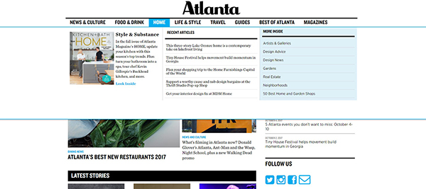 如:Atlanta Magazine這個網(wǎng)站的大型導航菜單給人的體驗就非常流暢,下拉菜單中嵌入了大量的鏈接,另外由于響應式的滑動導航在移動端上也已經(jīng)很常見了,這使得它還輕松兼顧到了移動端的設計。